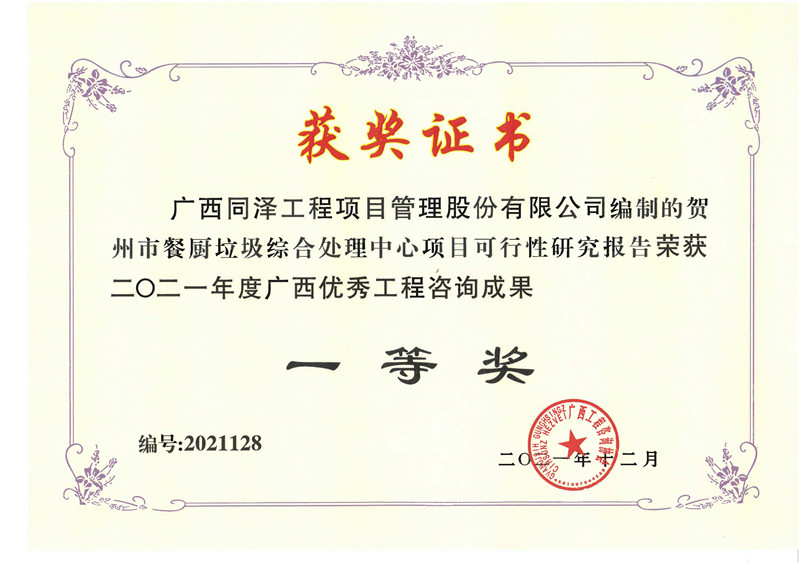 贺州市餐厨垃圾综合处理中心项目荣获2021年度广西优秀工程咨询成果一等奖