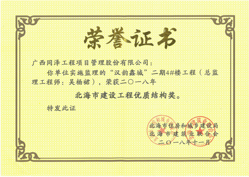 汉韵鑫城二期4#楼工程项目荣获2018年度“建设工程优秀结构奖”