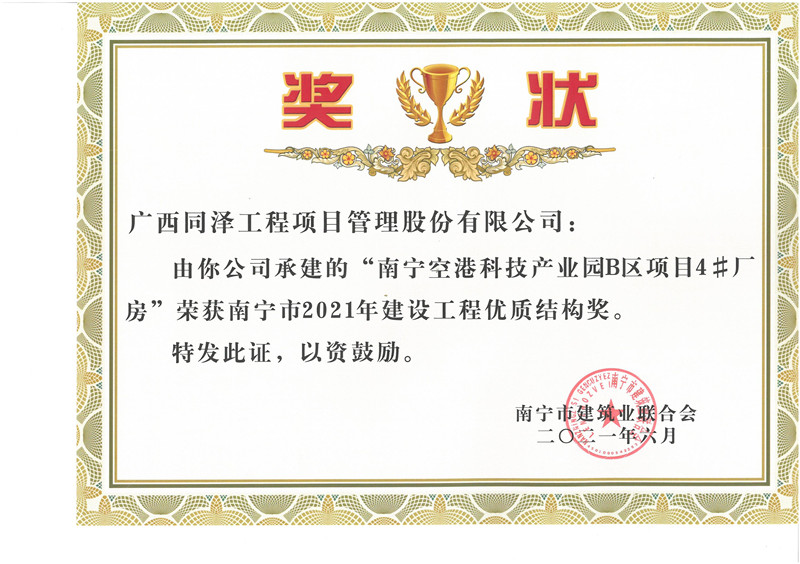 南宁空港科技产业园B区4#厂房项目荣获2021年度建设工程优质结构奖