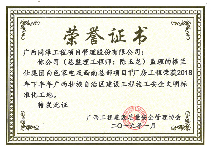 格兰仕集团白色家电及西南总部项目荣获2018年度安全文明标准化工地