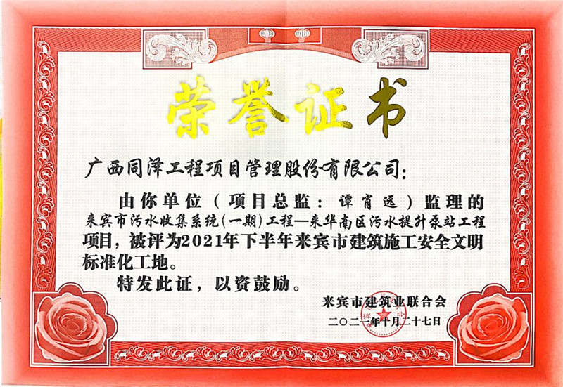 来宾市污水收集系统(一期)工程——来华南区污水提升泵站工程荣获2021年度安全文明标准化工地