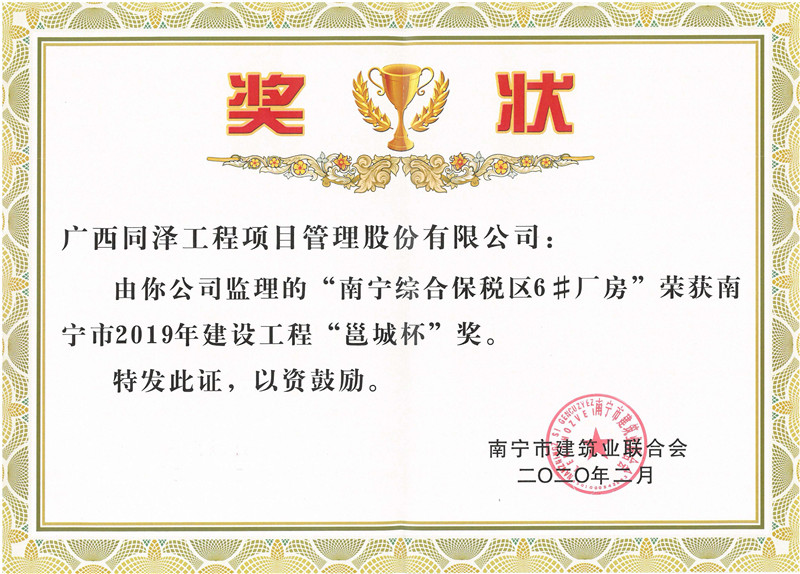 南宁综合保税区6#厂房项目荣获2019年建设工程“邕城杯”奖