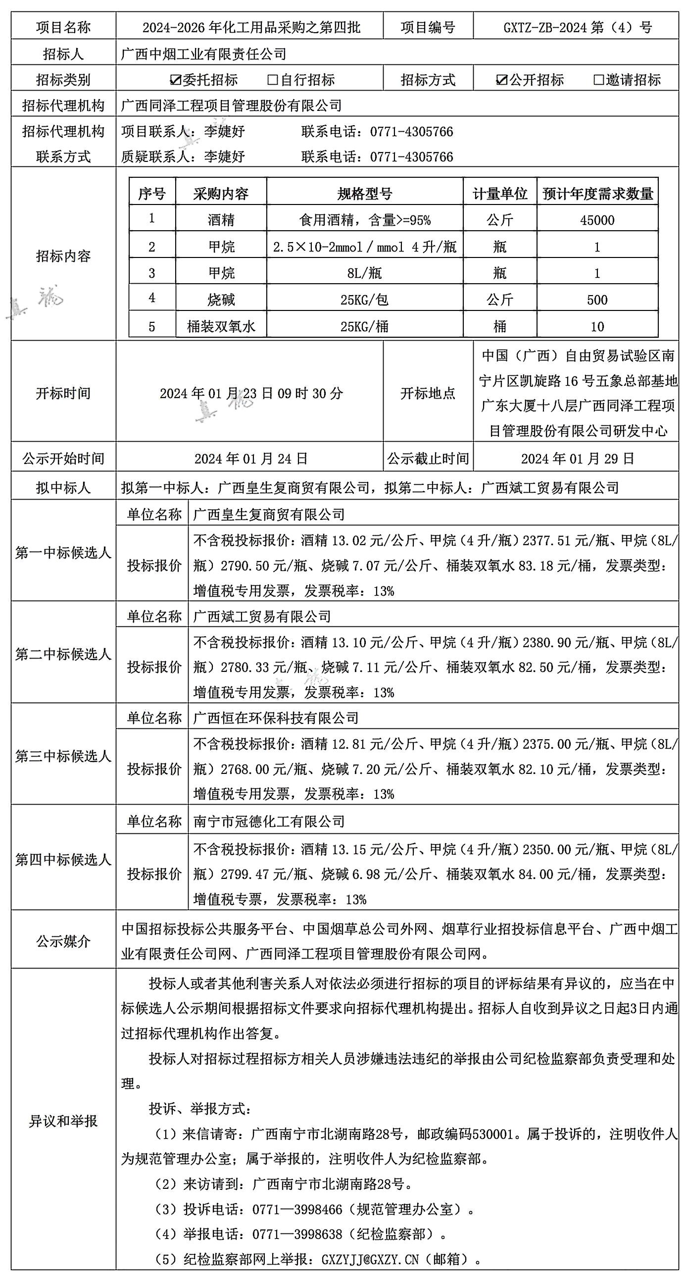广西中烟工业有限责任公司2024-2026年化工用品采购之第四批(项目编号:GXTZ-ZB-2024第(4)号)中标候选人公示