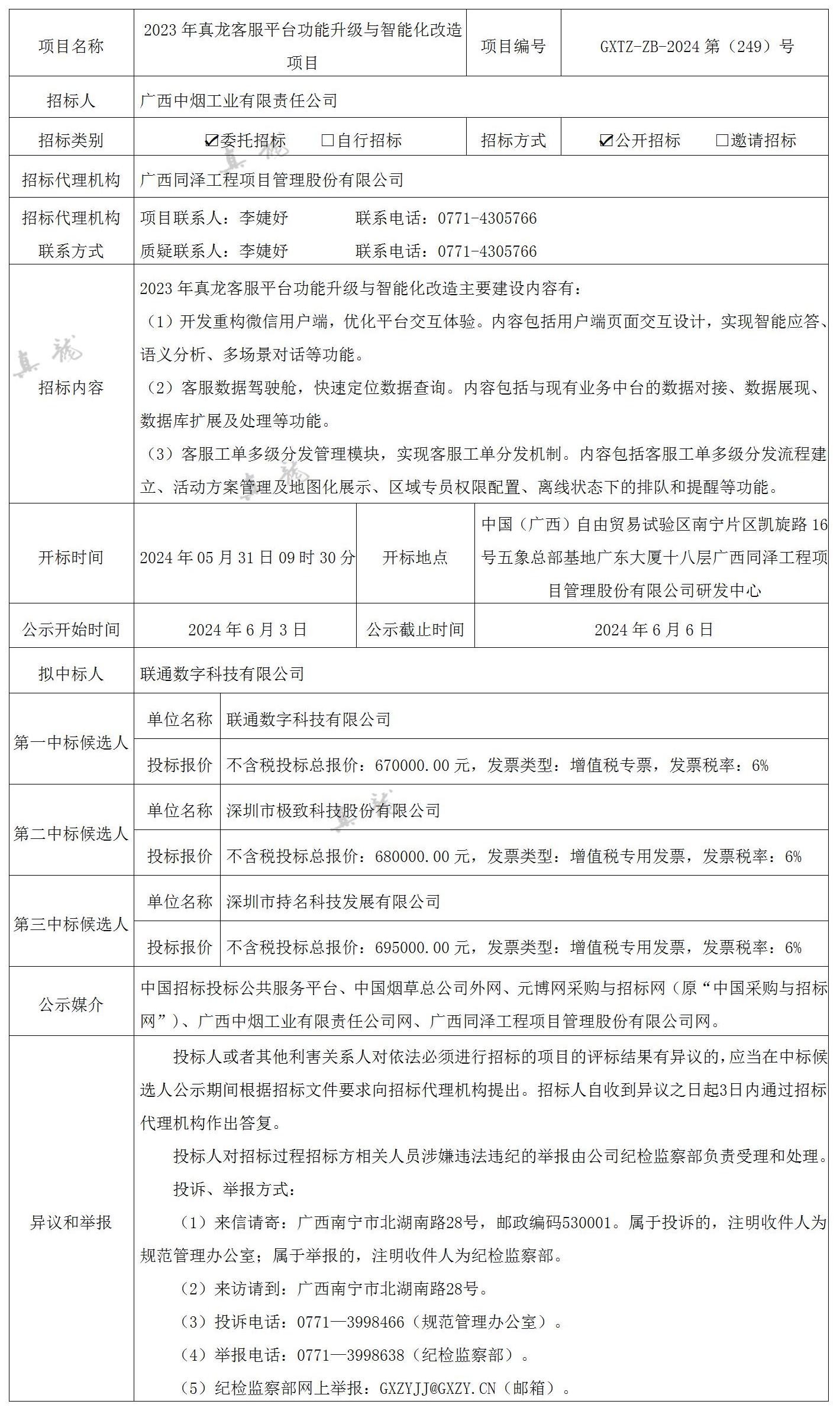 广西中烟工业有限责任公司2023年真龙客服平台功能升级与智能化改造项目(项目编号:GXTZ-ZB-2024第(249)号)中标候选人公示