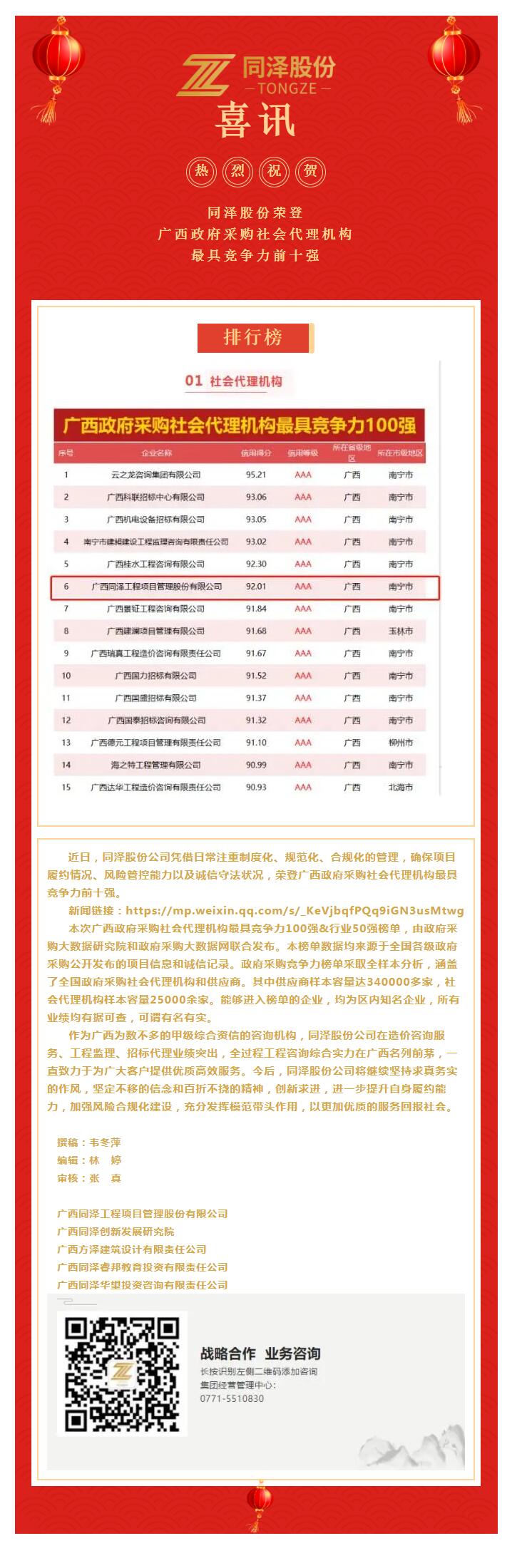 喜讯|同泽股份荣登广西政府采购社会代理机构最具竞争力前十强