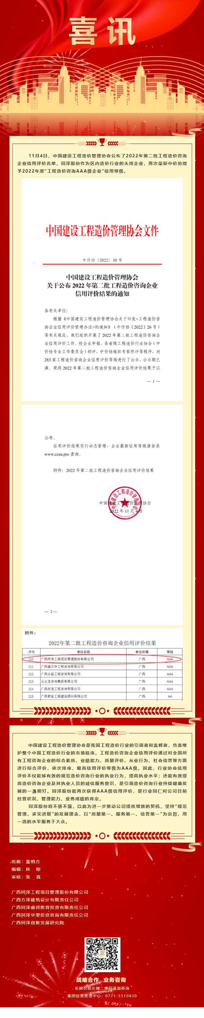 喜讯丨同泽股份荣获中价协授予2022年度“工程造价咨询AAA级企业”信用等级