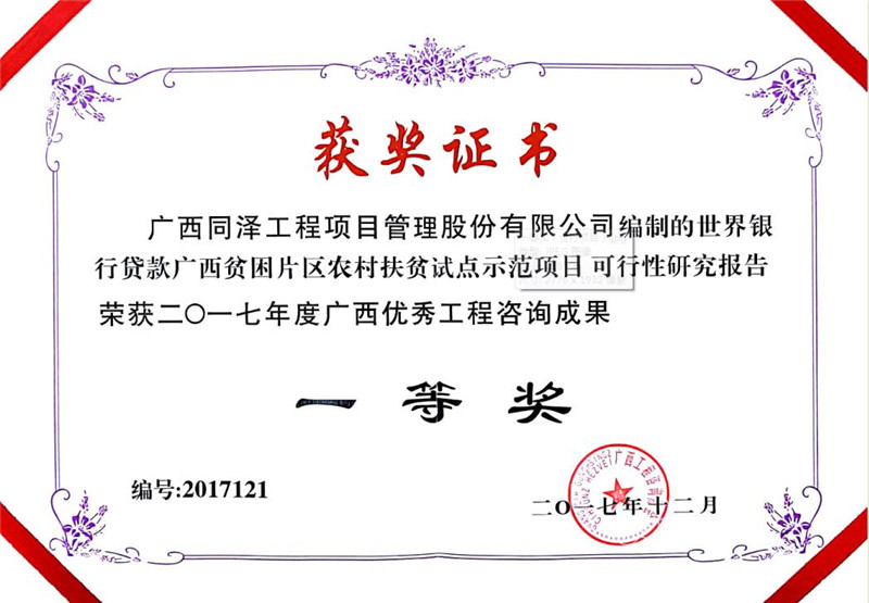 世办银行贷款广西贫困片区农村扶贫试点示范项目可行性研究报告荣获2017年度广西优秀工程咨询成果一等奖