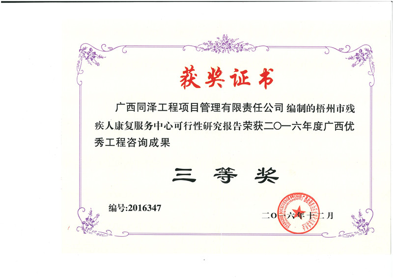 梧州市残疾人康复服务中心可行性研究报告荣获2016年度广西优秀工程咨询成果三等奖