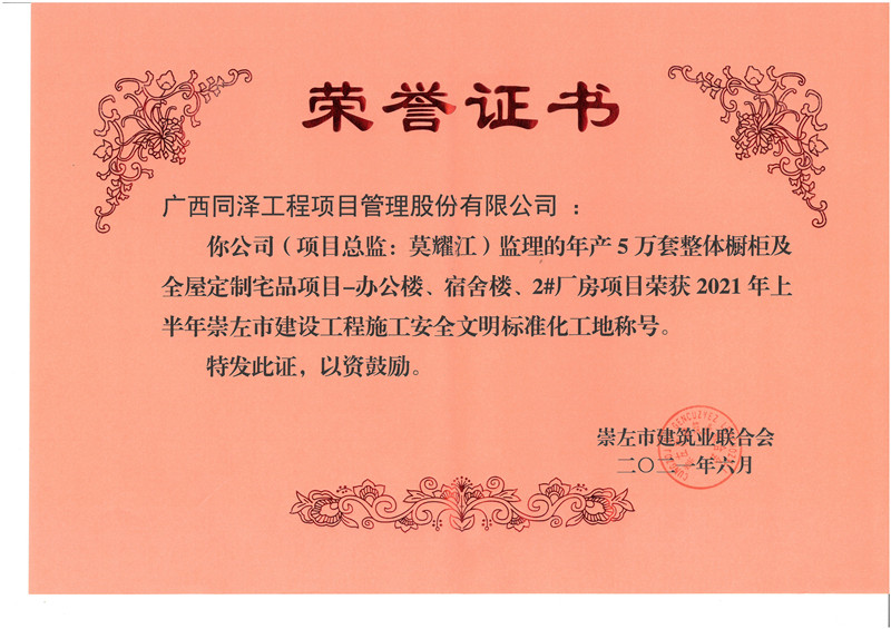 年产5万套整体橱柜及全屋定制宅品二期项目荣获2021年崇左市安全文明工地
