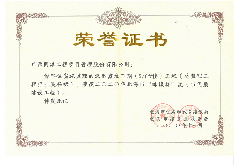 汉韵鑫城5#、6#楼荣获2020年北海市“珠城杯奖”(市优质建设工程)