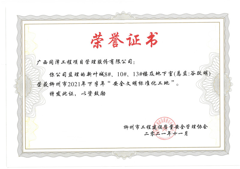 柳州新叶城项目8#、10#、13#楼及地下室项目荣获柳州市2021年下半年安全文明标准化工地