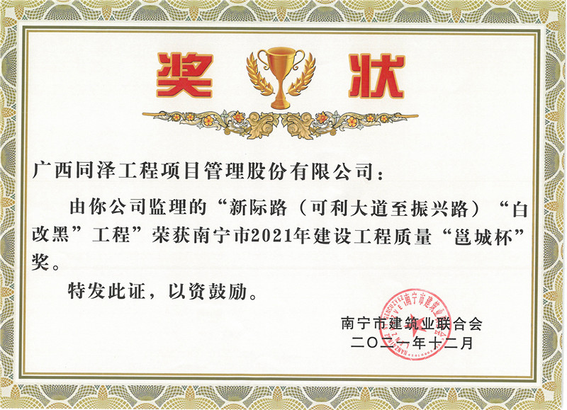 新际路(可利大道至振兴路)“白改黑”工程荣获南宁市2021年建设工程质量“邕城杯”奖
