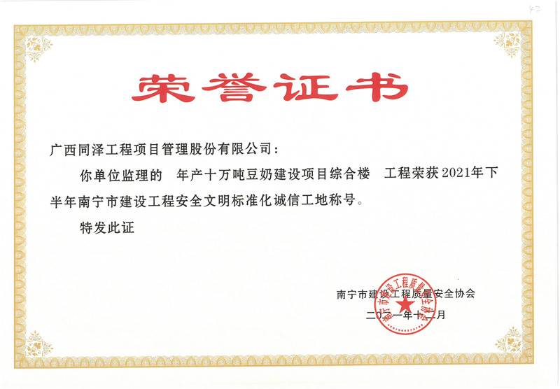 年产十万吨豆奶建设项目综合楼项目荣获2021年下半年南宁市建设工程安全文明标准化诚信工地称号