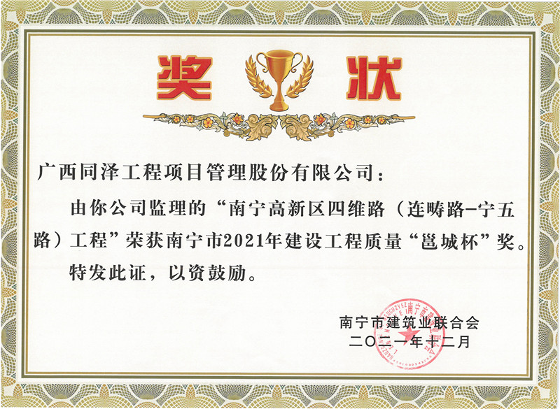 南宁高新区四维路(连畴路-宁五路)工程荣获南宁市2021年建设工程质量“邕城杯”奖