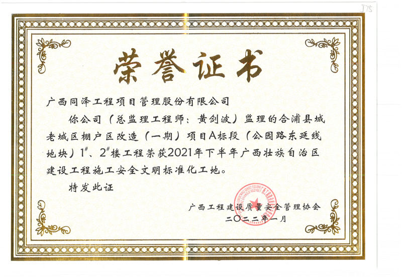 合浦县城老城区棚户区改造(一期)项目A标段项目荣获2021年(下半年)广西壮族自治区建设工程施工安全文明标准化工地