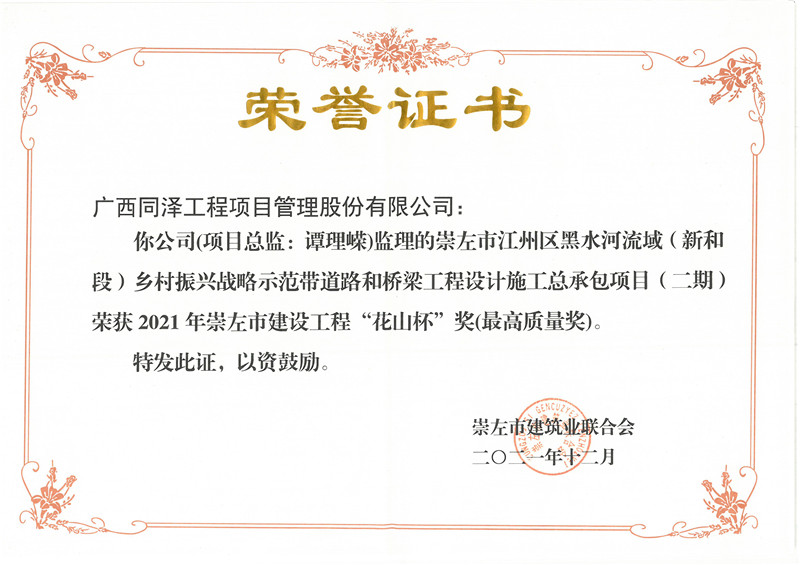 崇左市江州区黑水河流域(新和段)乡村振兴战略示范带道路和桥梁工程设计施工总承包项目(二期)项目荣获2021年崇左市建设工程“花山杯”奖(最高质量奖)